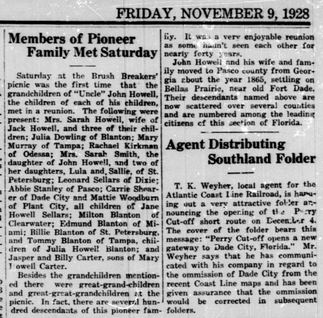 Aged Matron Succumbs At DunedinWas Pioneer Resident of Pasco County; Buried at Mt. Zion Cemetery![]() Mrs. Sarah Howell, aged and respected citizen of Dunedin, died at the home of her son, Oliver Howell, on Sunday, October 9. She was 82 years of age at the time of her death. Funeral services were held in Dade City Monday at Mt. Zion cemetery, the Rev. J. A. Hendry, pastor of the Methodist church, officiating. Mrs. Howell was born in Lakeland, Ga. and moved to Dade City with her parents, in 1867. She was married to Jack J. Howell in Dade City on December 23, 1869. Mr. Howell preceded her to the Great Beyond, having died May 31, 1915. Mrs. Howell lived in Pasco County until 1920 when her health beginning to fail. In declining years, she moved to Dunedin to make her home with one of her sons, Oliver Howell. She was well known in Pasco county, loved and respected by all who knew her as attested by the large gathering of sorrowing friends and relatives who gathered at Mt. Zion cemetery to pay their last respects. Mrs. Howell was a member of the Methodist church, having belonged to that denomination since early childhood. She was a charter member of the old Mt. Zion Methodist Church, which stood in the early history of Pasco County at what is now the Mt. Zion Cemetery. The floral offerings were many and very beautiful. Especial mention should be made of the floral piece from the firemen of Tampa, of which her as a member. The floral offering from her children, of two-toned roses, lilies of the valley, and baby breath and asparagus fern was buried in the casket. The Order of Eastern Star of Tampa, and the Oak Grove P. T. A. also sent beautiful wreathes and spirals. Active pall bearers were grandsons Ralph and Warren Dowling, Inman Howell, Wilton Kirkman, Marvin and Claude O'Berry. Honorary pall bearers were composed of nephews of the deceased: Jack O'Berry and Billy Blanton of St. Petersburg, Tommy and Ashley Blanton of Tampa, Leonard Sellers of Brooksville, and J. C. Carter of Dade City. Two of her grandchildren rendered a vocal selection, “Ivory Palaces,” during funeral services. Mrs. Howell is survived by six daughters and two sons: Mrs. Mary Murray and Mrs. Clorie Geiger of Tampa, Mrs., S. H. O'Berry, Mrs. C. E Dowling, Mrs. Rachel Kirkman of Dade City, and Mrs. Malissa Dorothy of Dunedin, Oliver Howell and J. L. Howell of Dunedin. Funeral arrangements were in charge of the Coleman Ferguson Company, morticians of Dade City. (Clorie Geiger taught at Gary School in Tampa. Rachel Kirkman was principal of Oak Brook School. Mary Murray was principal at DeSoto School in Tampa. Photos in 1932.)
