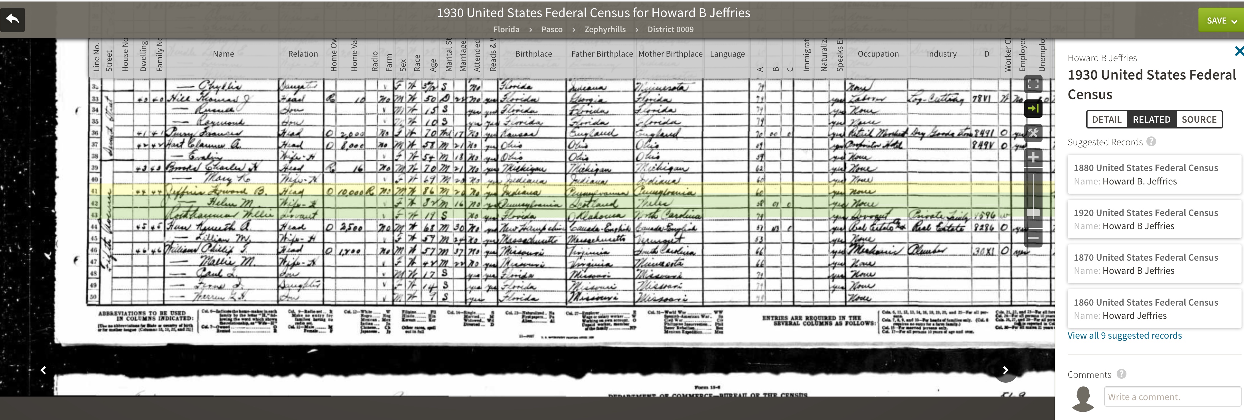 HISTORY OF PASCO COUNTYHoward B. Jeffries InformationIn 1995, residents of Zephyrhills, Florida, applied to have the home of Howard B. Jeffries added to the National Register of Historic Places. Unfortunately, the 1995 application misstated his name as Harold B. Jeffries. The mistake was at some point corrected and the database of the National Register of Historic Places does now correctly list the residence as the Capt. Howard B. Jeffries House. However, the effect of the 1995 mistake persists widely on the Internet. A Google search finds far more hits for “Harold B. Jeffries” than it does for his actual name. Here is some evidence that his correct first name is, in fact, Howard. This screen grab from the database of the National Register of Historic Places shows that the mistake has been corrected by that organization here. The headstone (gravemarker) of Mr. Jeffries gives his name as Howard B. Jeffries here. The application for Mr. Jeffries’ headstone is here. A St. Petersburg Times article about the Jeffries home correctly calls him Howard B. Jeffries here. A screengrab from ancestry.com shows that the 1930 census (and censuses from 1860, 1870, 1880, and 1920) give his first name as Howard here. |