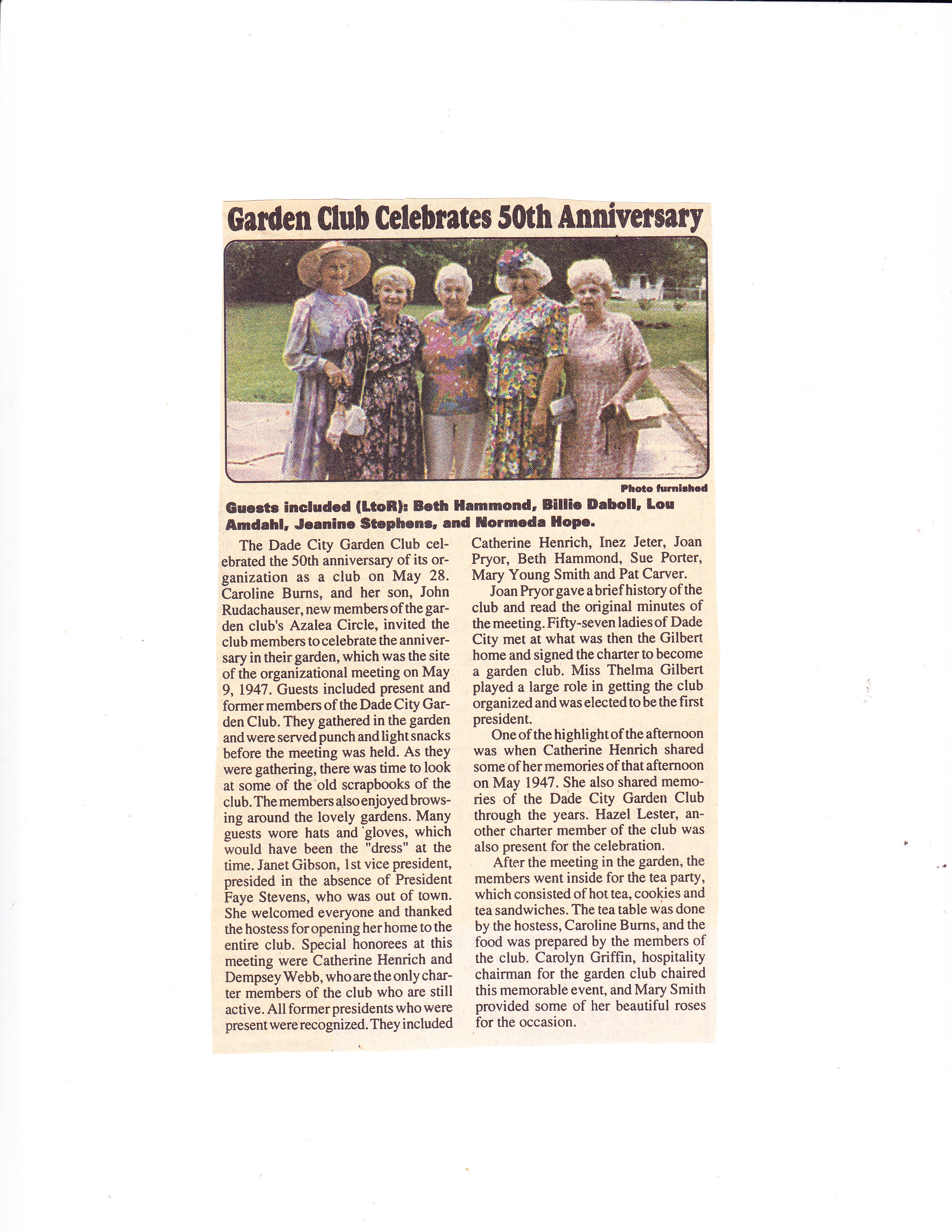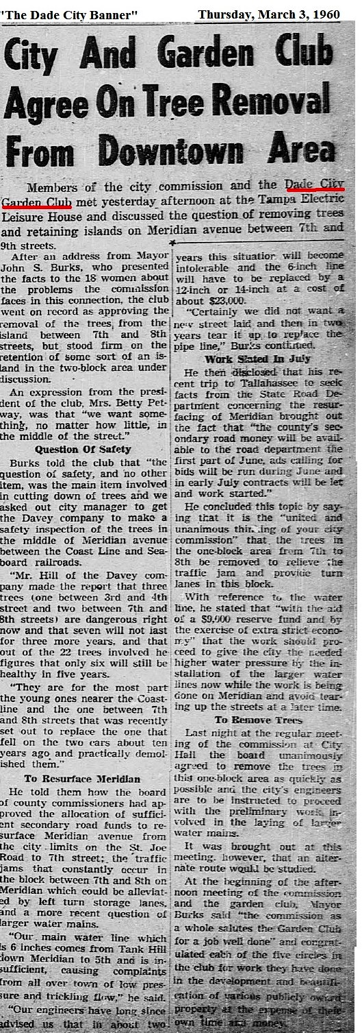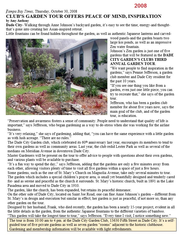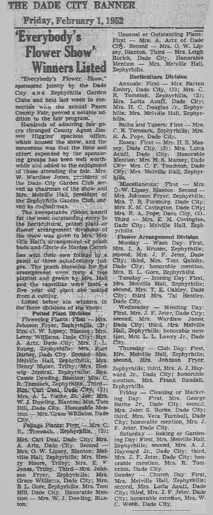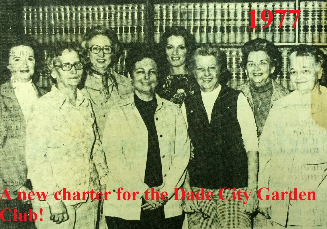 History of Dade City Garden Club (1993)This article appeared in the Pasco Shopper / Pasco News on June 30-July 1, 1993. By INEZ JETER, BETTERY DENLINGER, JEWEL ATKINSON, and MARGRET JONES On May 9, 1947, a group of local women met with Thelma Gilbert and Mrs. John Dolcater of Tampa, past president of the Tampa Federation of Garden Clubs, to discuss the purpose and organization of a Dade City Garden Club. The ladies voted to organize the club and the date of the meetings was set as the second Wednesday of each month at 10 a.m. September through May. The following officers were elected from the floor: President, Miss Thelma Gilbert; First Vice-president, Pearl Bessinger; Second Vice-president, Mildred Huckabay; Recording Secretary, Vee B. Jones and Treasurer, Christine Slough. The president-elect appointed the following committee chairmen following the outline of the Florida Federation of Garden Clubs: Awards and finance - Mae Peek; birds and conservation - Dorothy Lock; civic - Essie Blitch; distribution - Louise Edwards; flower show - Martha Covington; horticulture - Ruth Massey; junior gardens - Elizabeth Thomas; historian - Vivian Dayton; membership - Grace Larkin; visiting gardens - Madelyn Butler; roadside development - Bernice Felbert; publicity - Vee Jones and program and literature - Betty Burks. The rate for club dues was set at $1.50 per member until the new club year beginning in Sept. 1947. On Sept 10, 1947, the beginning of the 1947-1948 club year, the first meeting was held at the Woman’s Club building. It was a banner day. Club year books were distributed, annual dues paid, the By-Laws chairman presented the constitution and by-laws which were accepted after some changes presented from the floor. The Dade City Garden Club was accepted for federation with the Florida Federation of Garden Clubs on April 21, 1948. During the annual meeting on May 19, 1948, a decision was made to divide the membership and organize into five circles, the names being drawn for each circle and the chairman of each designated. Hibiscus - Pearl Bessinger; Hollyhock - Mildred Price; Magnolia - Mae Peek; Mimosa - Leta Thornton and Poinsettia - Catherine Deal. The first Flower Show was presented to the public on March 31, 1949 at the Womans Club Building. Theme of the show was “The Spirit of Spring.” This first show ushered in a succession of 18 additional ones, several of which were most outstanding. The 1953 event, theme, “Old South,” held at the Pasco County Fairgrounds building, won the National Purple Rosette Award. This award is given on the quality of the entire show from the schedule, staging and theme carried throughout the presentation. This award is much coveted by all clubs. Dade City also won the scrap book award the same year. On May 6, 1949, the Club Charter was filed with 57 names on the signature list. Records for the years between September 1949 and September 1958 are not available; therefore the history of that period will be sketchy. Of historical importance during this time are the general club civic projects. Among these were the landscaping of the Dade City Grammar School, Dade City Armory, Pasco High School (now Pasco Junior High), Pasco Elementary School, the Chamber of Commerce, Jackson Memorial Hospital (after both new additions). Dade City Grammar is now Rodney B. Cox Elementary School. On Arbor Day, January 1963, a magnolia tree was planted by the club, dedicated to the building committee of Jackson Memorial Hospital. Arbor Day, January 1964 the club planted two palms on the hospital grounds and again trees were planted on a similar date in 1965. The apex on West Meridian and Florida 52 and 41 was also a club project. Live oaks and red bud trees were planted on the American Legion grounds by the general club ladies. Radio Garden Tips were presented monthly. Other events included a bookshelf established at Hugh Embry Library honoring past presidents and as a memorial for club members. Several Junior Garden awards were won during this time. In cooperation with the City, we worked at planting and tree trimming around the community. Our involvement became evident in many ways as cooperating with other civic clubs we bought and installed a Club Emblem on the wire “Welcome” signboard north of the city. With records starting September 1958, the incoming president was Joyce Covington. The Garden Center Committee continued to look for available property to establish a center. The most desirable spot was the Henry Property on South 5th Street, 2.3 acres for the total of $9,000. It was available for $1,000 down, and $75 plus interest monthly. On the property were several fruit trees. After much discussion the club voted 19 to 8 to purchase the property. Being a non-profit organization, in order to support the civic projects and pay for the property, it became necessary to promote many luncheons, fashion shows, silver teas, bazaars, smorgasbords, plant sales, bake sales and a Variety Show held at Pasco High School. In 1959-60, Charles Jackson, then city manager, John Burks, mayor, and the entire commission met with the club and discussed landscaping islands on Meridian. The five circles did the gardening and were commended by the commission. In 1965, Dade City was declared a bird sanctuary and signs were erected at all entrances to the city. After seven years, on May 24, 1966, the Land Mortgage was burned, and ten years later, in August 1976, Saint Rita Catholic Church gave us our present clubhouse, which they used as a church before building the new one on 14th Street. This church was built in 1913 with several additions throughout the years. President Inez Jeter called a special meeting that August and plans to move the church to the Garden Club property were begun. Tillman Smith, a building mover from Lakeland, began the great responsibility. The club hoped that the steeple could be removed so it could be used as a gazebo on the grounds but it had to be torn off. Flori