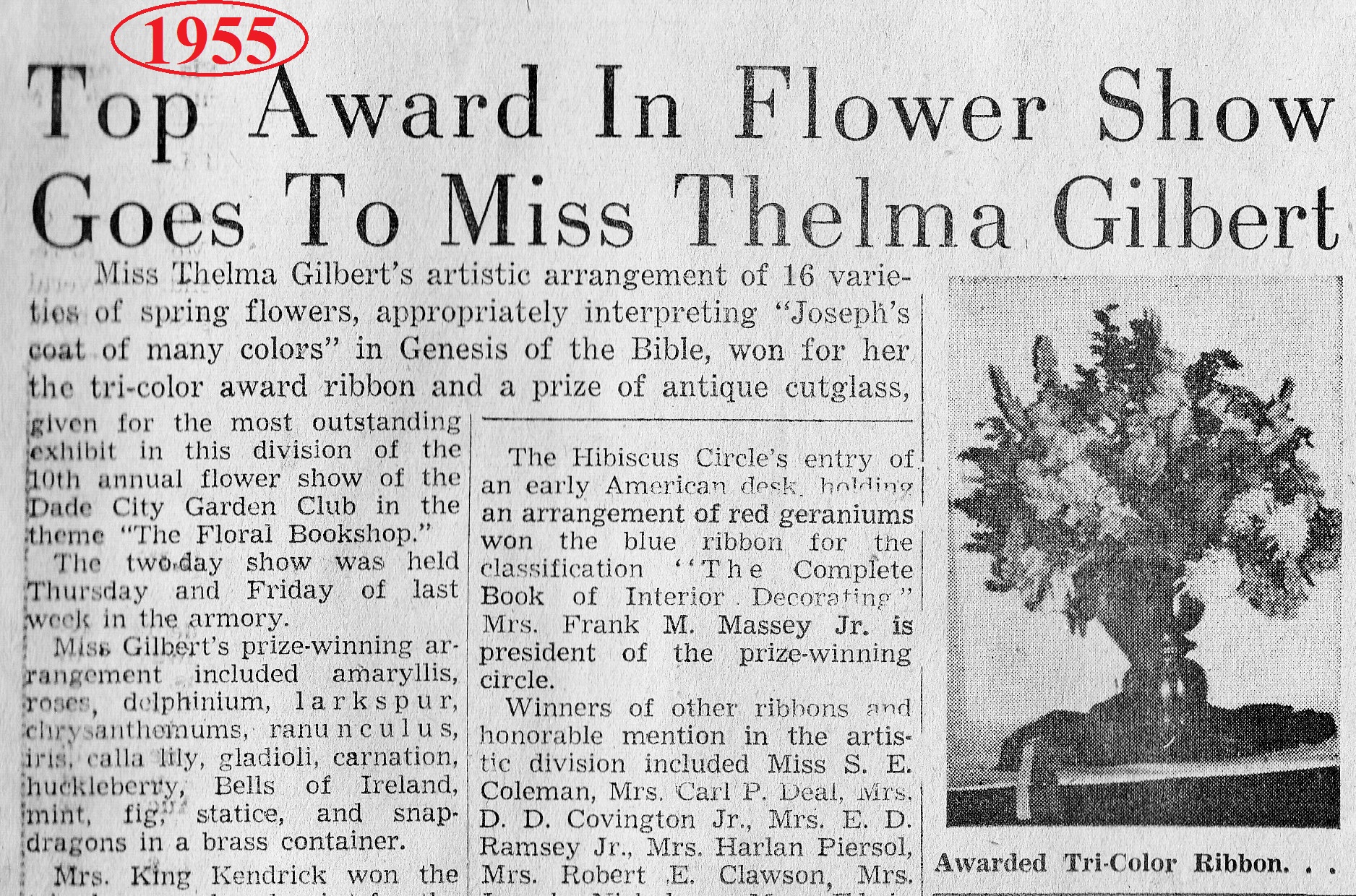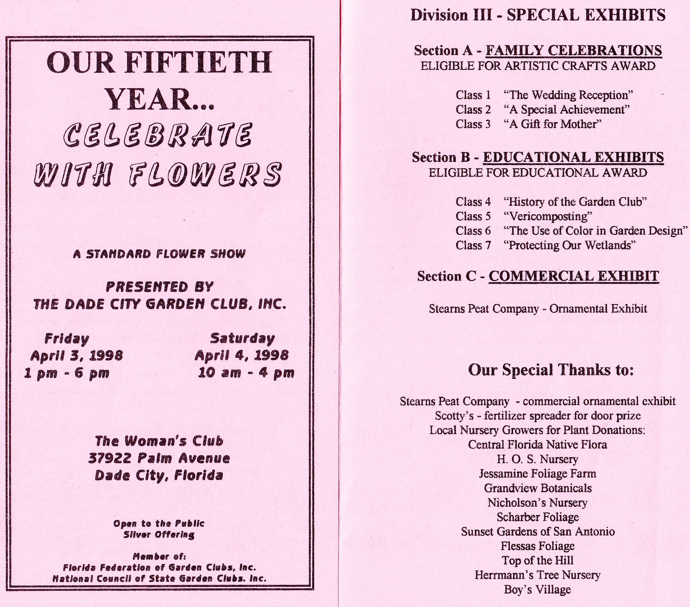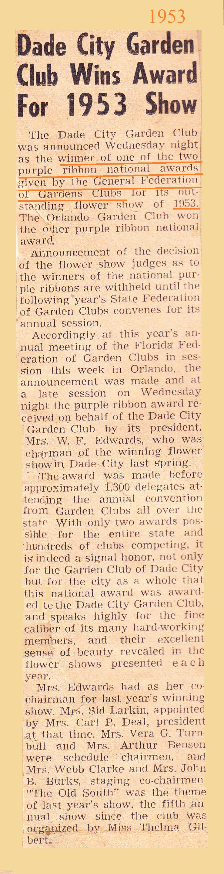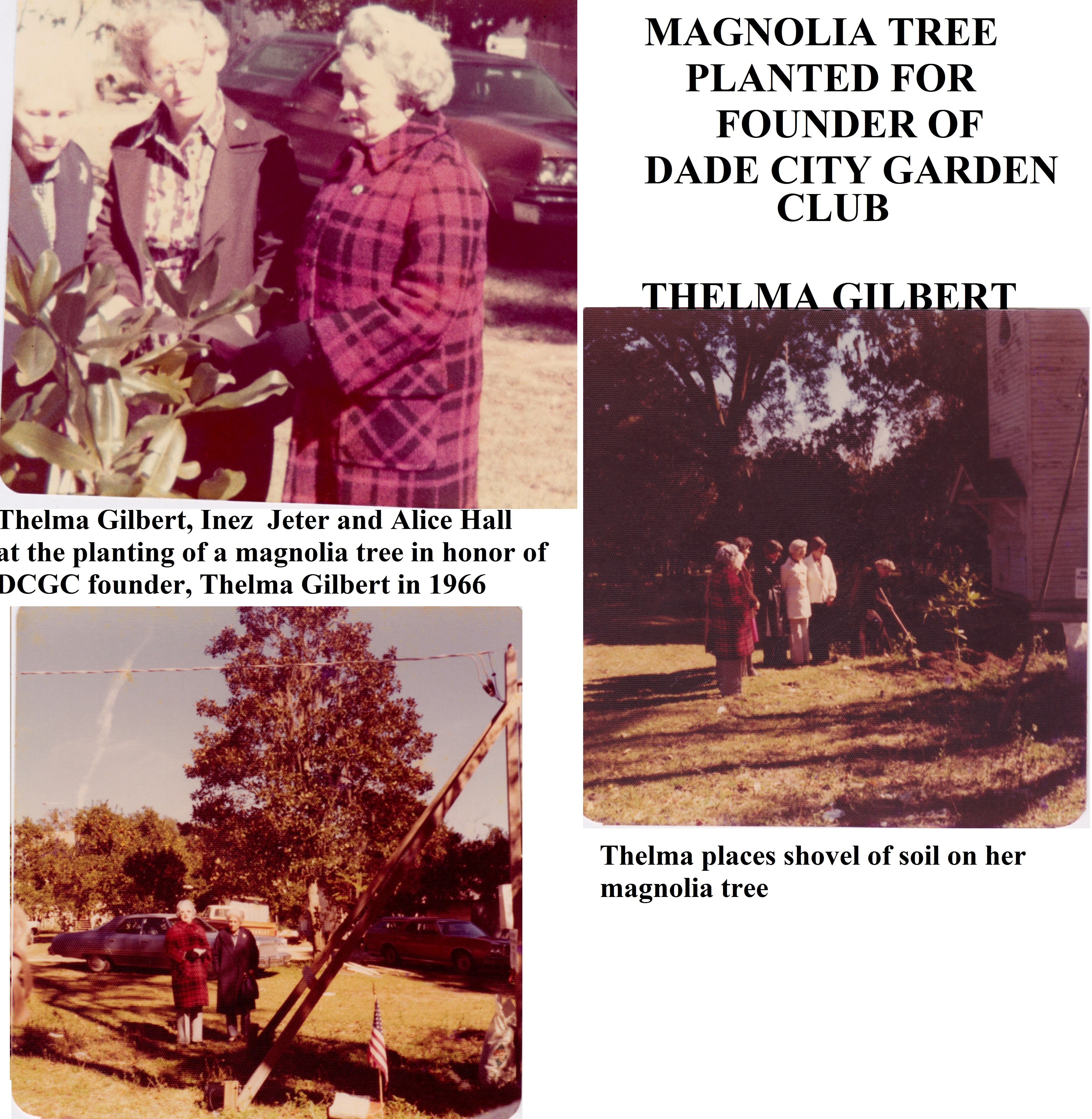 History of Dade City Garden Club (1993)This article appeared in the Pasco Shopper / Pasco News on June 30-July 1, 1993. By INEZ JETER, BETTERY DENLINGER, JEWEL ATKINSON, and MARGRET JONES On May 9, 1947, a group of local women met with Thelma Gilbert and Mrs. John Dolcater of Tampa, past president of the Tampa Federation of Garden Clubs, to discuss the purpose and organization of a Dade City Garden Club. The ladies voted to organize the club and the date of the meetings was set as the second Wednesday of each month at 10 a.m. September through May. The following officers were elected from the floor: President, Miss Thelma Gilbert; First Vice-president, Pearl Bessinger; Second Vice-president, Mildred Huckabay; Recording Secretary, Vee B. Jones and Treasurer, Christine Slough. The president-elect appointed the following committee chairmen following the outline of the Florida Federation of Garden Clubs: Awards and finance - Mae Peek; birds and conservation - Dorothy Lock; civic - Essie Blitch; distribution - Louise Edwards; flower show - Martha Covington; horticulture - Ruth Massey; junior gardens - Elizabeth Thomas; historian - Vivian Dayton; membership - Grace Larkin; visiting gardens - Madelyn Butler; roadside development - Bernice Felbert; publicity - Vee Jones and program and literature - Betty Burks. The rate for club dues was set at $1.50 per member until the new club year beginning in Sept. 1947. On Sept 10, 1947, the beginning of the 1947-1948 club year, the first meeting was held at the Woman’s Club building. It was a banner day. Club year books were distributed, annual dues paid, the By-Laws chairman presented the constitution and by-laws which were accepted after some changes presented from the floor. The Dade City Garden Club was accepted for federation with the Florida Federation of Garden Clubs on April 21, 1948. During the annual meeting on May 19, 1948, a decision was made to divide the membership and organize into five circles, the names being drawn for each circle and the chairman of each designated. Hibiscus - Pearl Bessinger; Hollyhock - Mildred Price; Magnolia - Mae Peek; Mimosa - Leta Thornton and Poinsettia - Catherine Deal. The first Flower Show was presented to the public on March 31, 1949 at the Womans Club Building. Theme of the show was “The Spirit of Spring.” This first show ushered in a succession of 18 additional ones, several of which were most outstanding. The 1953 event, theme, “Old South,” held at the Pasco County Fairgrounds building, won the National Purple Rosette Award. This award is given on the quality of the entire show from the schedule, staging and theme carried throughout the presentation. This award is much coveted by all clubs. Dade City also won the scrap book award the same year. On May 6, 1949, the Club Charter was filed with 57 names on the signature list. Records for the years between September 1949 and September 1958 are not available; therefore the history of that period will be sketchy. Of historical importance during this time are the general club civic projects. Among these were the landscaping of the Dade City Grammar School, Dade City Armory, Pasco High School (now Pasco Junior High), Pasco Elementary School, the Chamber of Commerce, Jackson Memorial Hospital (after both new additions). Dade City Grammar is now Rodney B. Cox Elementary School. On Arbor Day, January 1963, a magnolia tree was planted by the club, dedicated to the building committee of Jackson Memorial Hospital. Arbor Day, January 1964 the club planted two palms on the hospital grounds and again trees were planted on a similar date in 1965. The apex on West Meridian and Florida 52 and 41 was also a club project. Live oaks and red bud trees were planted on the American Legion grounds by the general club ladies. Radio Garden Tips were presented monthly. Other events included a bookshelf established at Hugh Embry Library honoring past presidents and as a memorial for club members. Several Junior Garden awards were won during this time. In cooperation with the City, we worked at planting and tree trimming around the community. Our involvement became evident in many ways as cooperating with other civic clubs we bought and installed a Club Emblem on the wire “Welcome” signboard north of the city. With records starting September 1958, the incoming president was Joyce Covington. The Garden Center Committee continued to look for available property to establish a center. The most desirable spot was the Henry Property on South 5th Street, 2.3 acres for the total of $9,000. It was available for $1,000 down, and $75 plus interest monthly. On the property were several fruit trees. After much discussion the club voted 19 to 8 to purchase the property. Being a non-profit organization, in order to support the civic projects and pay for the property, it became necessary to promote many luncheons, fashion shows, silver teas, bazaars, smorgasbords, plant sales, bake sales and a Variety Show held at Pasco High School. In 1959-60, Charles Jackson, then city manager, John Burks, mayor, and the entire commission met with the club and discussed landscaping islands on Meridian. The five circles did the gardening and were commended by the commission. In 1965, Dade City was declared a bird sanctuary and signs were erected at all entrances to the city. After seven years, on May 24, 1966, the Land Mortgage was burned, and ten years later, in August 1976, Saint Rita Catholic Church gave us our present clubhouse, which they used as a church before building the new one on 14th Street. This church was built in 1913 with several additions throughout the years. President Inez Jeter called a special meeting that August and plans to move the church to the Garden Club property were begun. Tillman Smith, a building mover from Lakeland, began the great responsibility. The club hoped that the steeple could be removed so it could be used as a gazebo on the grounds but it had to be torn off. Flori