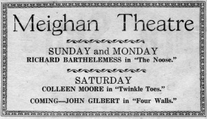 On Apr. 11, 1930, the New Port Richey Press reported, “There is a noticeable increase in patronage at the Meighan which is due to the perfection of the sound mechanism and a distinct understanding between Manager Poole and the film distributing agencies as to the quality of the releases assigned to the Meighan. The article also reported that the summer price schedule -- 40 cents for adults and 15 cents for children -- would go into effect next week. The newspaper also reported that the theater had recently offered a midnight show and would repeat the “innovation in the local amusement field” at “infrequent intervals.” On May 2, 1930, the New Port Richey Press reported that the theater would temporarily abandon the showing of sound pictures and return to silent films for the summer because improvements in the sound needed to be made; prices would be reduced to 10 cents and 20 cents. On Nov. 28, 1930, the New Port Richey Press reported that the Meighan Theatre had re-opened and had been leased by John W. Freeman, who had formerly operated a theater in Daytona Beach. The article stated that the Meighan Theatre would be open on Fridays through Sundays until patronage warranted remaining open full time. The admission price was set at 30 cents for adults and 15 cents for children.