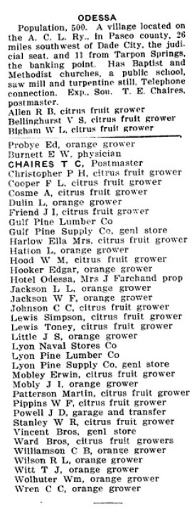 Odessa Invites an Inspection of Its Charms (1924)The following article appeared in the New Port Richey Press on Feb. 29, 1924.We take much pleasure in inviting you to pay Odessa a visit and see one of the prettiest and growing towns in the state. Odessa is located on the Atlantic Coat Line and Tampa and Gulf Coast railroad twenty-one miles from Tampa on the new asphalt road fifteen miles from the corner of Howard and Armenia Avenues. Odessa is noted for its beautiful lakes and citrus groves, also vegetable farms and flower gardens, not mentioning the large acres of avocadoes and other tropical fruits. Odessa has some of the best soil in the state for the production of vegetables such as beans, cucumbers, Irish potatoes, lettuce, peppers; in fact anything that can be grown in South Florida is being grown in and around Odessa. Calm Lake, one of the many beautiful lakes, is used by the residents of Odessa and other towns as a bathing place during the summer months. This lake has a clear sandy bottom with a beach-like shore, making it very attractive and inviting to the public as an ideal place for picnics and camping parties. The Boy Scouts from Odessa, Tampa, and other places spend quite a few week-ends around this beautiful lake. Mound lake, only a short distance, with its crystal like waters, is unexcelled by any lake in the country for a summer camping site. This [year] Y. M. C. A. of St. Petersburg has a summer camp on this lake with summer huts built in camp formation with streets and other attractive features. They have a commodious kitchen and dining hall, and a flag pole on top of one of the largest mounds near the camp. It looks as though nature formed this picturesque spot for just such a purpose. Seven Springs is only a very short distance with its beautiful flowing springs and wells of different kinds of mineral waters being located on the Anclote river making it an ideal place for afternoon picnics and camping parties. Drink all the water you care for out of the different springs, then grab your rod and reel and try your luck with the finny tribe.