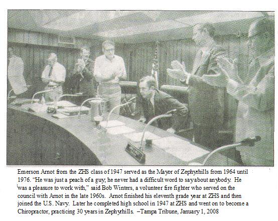 Dr. Emerson David Arnot, Jr. passed away December 27, 2007 at the Hernando Pasco Hospice in Dade City, Florida, Tampa Tribune, December 20, 2007. He was born August 14, 1925, in Crystal Springs, Florida to Dr. Emerson Arnot Sr. and Louise Marie Dechambeau-Arnot. The family moved to Zephyrhills, Florida, the following year. He attended school in Zephyrhills through the 11th grade, and then enlisted in the U.S. Navy and served during World War II on the USS Aucilla AO-56. The Aucilla was involved in operations in both the Atlantic and Pacific. After the war, he was honorably discharged. He then returned to Zephyrhills to finish his senior year of high school and graduated with his brother and sister in the class of 1947. He attended the National College of Chiropractic in Chicago, Illinois, and graduated in 1950. He then went into practice with his father in Zephyrhills. He married Joan N. Johnson June 10, 1952. Emerson and Joan had two daughters, Suzanne Marie and Sheree? Louise. He practiced in Zephyrhills for 38 years. When he retired, the practice was carried on by his nephew, John M. Arnot. He was active in city affairs for many years. He was a volunteer fireman and a city councilman who spearheaded the reclamation of the much-neglected Zephyr Park in 1962. He then served as Mayor from 1964-1976. He was then reelected to the City Council in 1976, following a recall election. He is survived by his wife, Joan; two daughters, Suzanne Marie Morgan and her husband, Ray, of Crystal Springs and Sheree? Louise Newell and her husband, Michael, of Zephyrhills; his three grandchildren, Johanna Bonnie Theel, and her husband, Bobby, Jacob Edwin Newell and Tess Marie Newell, all of Zephyrhills, a great-grandson, R. Conway Theel; and his sister, June Eiland of Zephyrhills. He was preceded in death by his sisters, Louise VanAs and Annette Green and his brother, John E. Arnot.