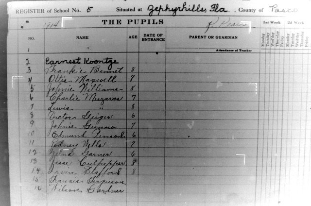 The registers from 1914 which include the student’s names (as posted below) were: Frankie Bement, age 8; Jessie Culpepper, age 8; Beryl DeRyder, age 9; Francis Furgeson, age 8; William Gardner, age 8; Nellora Garner, Zelma Garner, age 6; age 6; Victor Geiger, age 6, Zella Geiger, age 6; Dorothy Gilbert, age 6; Johnnie Gumoe, age 7; Teddy Holm, age 6; Earnest Koontze (no age listed); Lena Lisenby, age 8; Ottis Maxwell, age 7; Charlie Mazaros, age 7, Luis Mazaros, age 7; Edmund Penrod, age 6; Nathan Siban, age 6; Bessie Stafford, age 12; Irvin Stafford, age 8; Edgar Taylor, age 8; and; Rodney Wells, age 7; Johnnie Williams, age 8. Parents were asked also to provide their names. These records were scanned by Jeff Miller of the fivay project from Pasco County School Board archives.