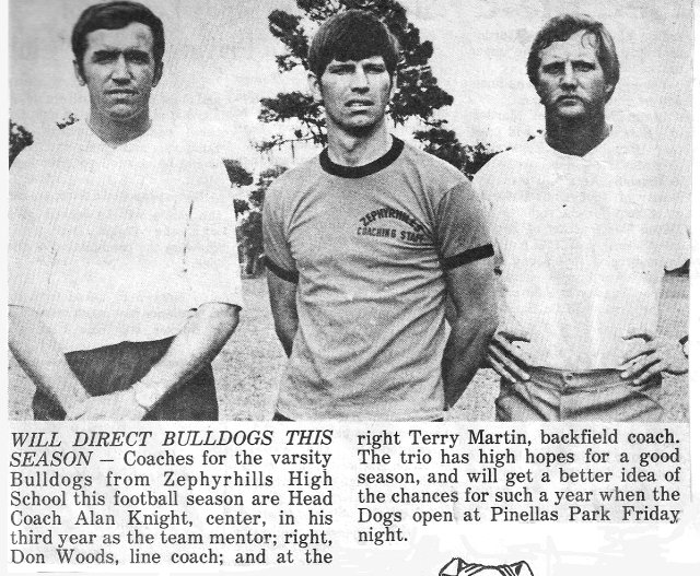 HISTORY OF ZEPHYRHILLS HIGH SCHOOLHighlights of 1976Knight Moves; Sikes Hired, Tampa Tribune, 1976Alan Knight has stepped down as head football coach at ZHS to take over as dean of boys and will be replaced by Dan Sikes, Principal Ray Stewart announced. “I am thrilled to death that my close friend Dan Sikes will be taking over the program, said Knight. “ I will receive my Master's Degree in June from the University off South Florida. I feel that my future lies in administration and look forward to my new position here.” Sikes was head football coach for the past two years at Land O’ Lakes High School. Earlier this year he resigned to become assistant football coach at Hillsborough High in Tampa. “I’m just a country boy at heart, said Sikes. I will finish out the year teaching physical education in Tampa, but am conducting spring football practice at Zephyrhills. “Alan and I are very close friends and it will be great together at Zephyrhills High.