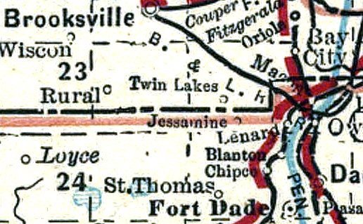 HISTORY OF PASCO COUNTYJessamine![]() This page was last revised on June 6, 2017. 1887. Walter N. Pike and William J. Ellsworth arrive and establish a seed and plant business called Jessamine Gardens. A post office was established at Jessamine in 1888. Aug. 13, 1901. The Tampa Morning Tribune reports, “The famous Jessamine gardens of Pasco county will exhibit at the State Fair.” Jan. 1, 1913. The Tampa Morning Tribune reports, “The Tampa Bay Land Company is very busy at this season driving prospective buyers over its lands in autos. It has sold fifteen hundred acres in the vicinity of Blanton and the Jessamine Grove to Germans from Minnesota, who expect to soon settle on the tract with people of their own nationality from the north.” Jan. 15, 1913. The Tampa Morning Tribune reports, “The water tower at the Jessamine groves is a marvel of beauty. It is completely covered with brilliant flame flowers. It is worth an auto trip from Tampa just to see it. Auto party after auto party visit the groves and are charmed with the gorgeous display.” March 6, 1914. H. M. Platt of New York, who had spent the winters at his home at Jessamine for 17 years, dies at 78. His daughter, Mrs. W. J. Ellsworth of the Jessamine Groves, lived with him. Dec. 24, 1914. The Tampa Morning Tribune reports, “C. J. Nathe, Messrs. Blocker and Dowling and Jessamine Groves are all heavy shippers of the kumquat fruit. The Jessamine Groves report shipments of 250 crates of ‘gold oranges’ last week.” Feb. 7, 1919. The Tampa Morning Tribune reports, “The fruit growers here are shipping a car of fruit every day from the Blanton packing house. They bought the fruit of the Jessamine grove. There has already been shipped over 40,000 boxes of fruit from Blanton this season. The Jessamine Grove’s Nurseries are very busy shipping citrus fruit trees, roses and ornamental plants from their large nurseries near Blanton.”