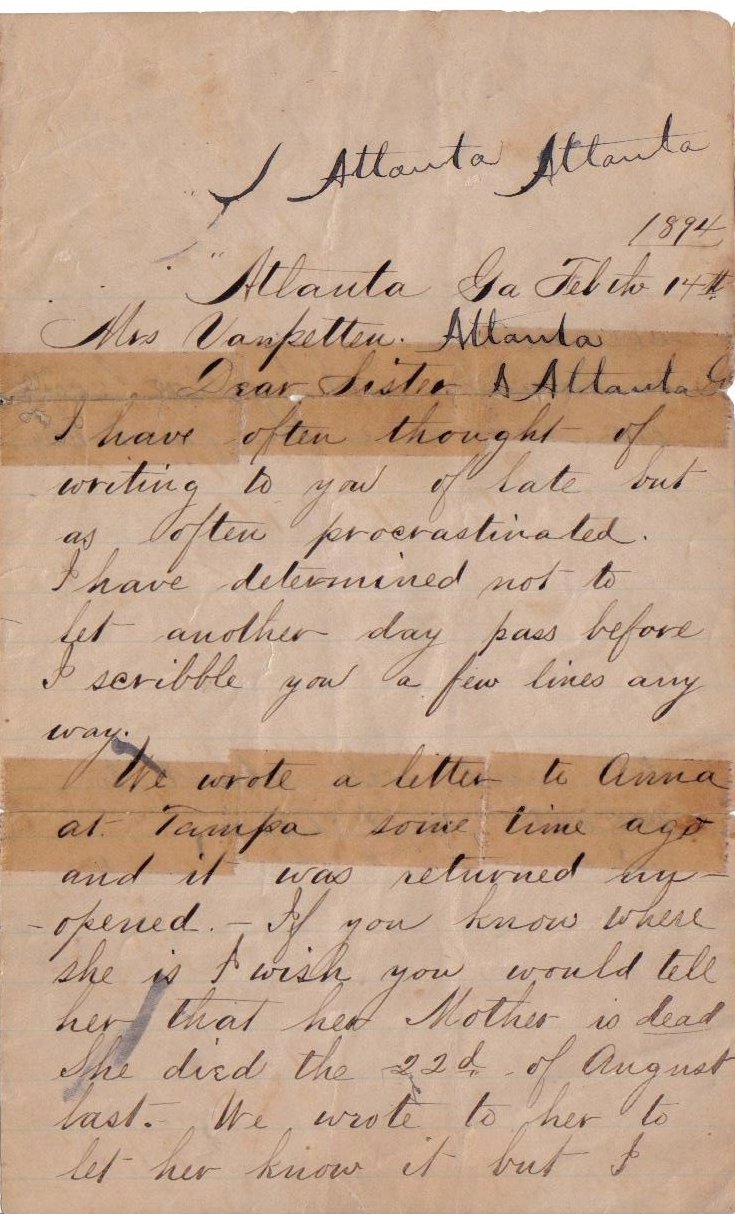 The following letter, provided by Laura Sowers Ford, was written in 1894 by Louis Hope Sowers and sent to her sister Chattie VanPetten. Laura believes she is trying to locate Anna Sowers Hope because her mother died the year before.