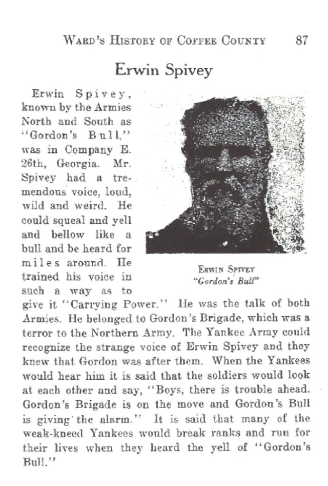 HISTORY OF PASCO COUNTYJames Irvin(g) (Ervin) Spivey (Spivy)Florida Baptist MinisterJune 17, 1837/38 - June 23, 1911Copyright by Judith R. Jolly 2012 - Used With PermissionSource Key: June 17, 1837. Birth in Thomas County, Georgia. Son of John Aaron Spivey and Martha Davis Spivey. (CSA-1902 claim; Ancestry) June 17, 1838. Birth in Thomas County, Georgia. Son of John Aaron Spivey and Martha Davis Spivey. (CSA-1909 claim; Ancestry; Other - www.findagrave.com) Sept. 1, 1843. Birth of Emily Ann Trowell (wife), daughter of Joseph Trowell and Emily Ann Ruth Trowell, South Carolina. (Other - Florida Death Certificate No. 10552, Emily Ann Spivey) (Other - www.findagrave.com) 1850. U.S. Census - Militia District 456, Appling, Georgia John Spivy, 34; Martha Spivy, 33; Irvin Spivy, 13; Effey E. Spivy, 8; Mariah Spivy, 6; Daniel P. Spivy, 4; Mathew Spivy, 1. (Ancestry) Apr. 1857. Marriage to Emily A. Trowell, Coffee County, Georgia. (CSA/W) April 18, 1861. Enlisted CSA at Waresboro, Georgia, Ware County, in Company Gordon’s Brigade, Company H, 13th Georgia Regiment (CSA 1902 claim). Company E, 26th Infantry Regiment, Georgia Volunteers. (CSA 1909 claim). May 10, 1862. Appointed 4th Corporal 26th Georgia (Other - Brantley Historical Society; www.rootsweb.ancestry.com/~gabrantl/roster-e3.html) 1864. Wounded at Lynchburg, Virginia. "I was shot in the right shoulder (minie ball) and wounded by a bomb shell in the right arm." (CSA) April 12, 1865. Discharged at Appomattox Court House, Virginia. (CSA) Jan. 1, 1875. "resided in state of Florida since January 1, 1875." (CSA) 1875. "Immediately after the war there was a rush of settlers . . . moving south. So came two brothers whose property in Coffee County, Georgia, had been destroyed by Sherman’s forces . . . John David and Irvin Spivey. Irvin Spivey had a most unusual voice with a unique carrying quality . . . General Gordon of the Confederacy discovered this. Bellowing like a bull, Irvin Spivey transmitted signals in code that could be heard for miles. The enemy learned that Gordon’s frequent devastating raids were in some way connected with this bellowing bull, and, unless they were well prepared, would avoid confrontation. On one occasion, the battle being joined, Gordon realized that his supply of ammunition was running out. He sent for young Spivey and said to him, 'If you have ever bellowed in your life, do it now. It is our last hope.' The enemy . . . retreated. 'The Bull' was given a citation and presented with a gold fountain pen engraved with his name and the date of that battle, September 4, 1864." John D. Spivey homesteaded and "called the place Oakdale." (Now the site of Zephyr Plaza on Hwy. 301 in Zephyrhills) He started a church, inviting ministers to preach. "When no preacher appeared, Irvin would read the Scriptures and lead discussions and prayers. He became so proficient at this that most Sabbath days found him leading services at Oakdale and nearby communities." The home became too small for the crowds, so they built an arbor in the woods. A building was then erected and used as a school and church until Lakeview Baptist Church was built. "The voice that had 'bellowed like a bull' in Virginia so shook the walls of their first building and the hearts and minds of the people with the spiritual fervor of the man that people came from miles around." These congregations are recognized as the early beginnings of FBC Zephyrhills. (RWT, The History of Zephyrhills 1821-1921) Dec. 24, 1876. Arrival in Florida, per Mrs. Spivey. (CSA/W) 1880. U.S. Census - Precinct 8 and 10, Hernando, Florida. J.I. Spivey, 41, farmer; Emily Spivey, 37. (Ancestry) 1882. "We notice that the Sand Hill church desires the ordination of brother J.I. Spivy to the ministerial office, we would advise that church to consult a Presbytery of ministers in regard thereto." (Other - 1882 South Florida Baptist Association Minutes, page 5) 1882. Pastor of Double Branch Baptist Church (Other - church records) 1885. Systematic Benevolence & Temperance committees; Ltr of Correspondence to SFBA, Manatee, Alachua, Wekiwa Assns. OM w/Dade City address (HBA) 1886. Served "4 months 14 days" as missionary for HBA ". . . designate and maintain a missionary to labor in the destitute parts of this association . . advisable to appoint Elder J.J. (I.) Spivy who was about to engage in the work of a colporteur in South Florida. . . Brother Spivy resigned on the 12th of April . . . difficulty of raising sufficient funds for his support. We subjoin a report of his work: Number miles traveled 696; Sermons preached 34; Prayers offered 96; Religious visits 58; Baptized 3; Waiting Baptism 1; Collected $25; Time 4 months 14 days. Received of Mission B(oard) $55.50." (HBA) 1886. Ordained Minister w/Tampa address; Family Worship Committee. Pastor of New Zion Baptist Church, Hillsborough County. (HBA) Feb. 2, 1887. Performed marriage of Thomas Fisher and Delila Walker. (Other - USF digitized Hillsborough County marriage records). 1887. Temperance Committee Chairman; Ordained Minister w/Keystone Park, Florida address. Pastor of Pleasant Hill Baptist Church (petitionary church, Pasco County). Pastor of New Zion Baptist Church, Hillsborough County. (HBA) May 9, 1888. Performed marriage of Simon J. Gant and Ada J. McCarty. (Other - USF digitized Hillsborough County marriage records). May 28, 1888. Performed marriage of Nicholas O. Waller and Sophronia Newbury. (Other - USF digitized Hillsborough County marriage records). June 10, 1888. Performed marriage of Green W. Robles and Emmaus E. Strickland. (Other - USF digitized Hillsborough County marriage records). 1888. Temperance Committee. Ordained Minister w/Magdalene address (Hillsborough). Pastor of Pleasant Hill Baptist Church, Pasco County. Pastor of Withlacoochee Baptist Church, Pasco County. (PBA) June 30, 1889. Performed marriage of James Jonathan Jackson and Eugenia Strickland. (Other - USF digitized Hillsborough County marriage records). 1889. Or