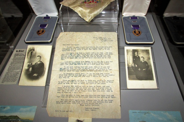 A glass-enclosed display at the Tampa Bay History Center displays photos and the Purple Hearts of the Sumner brothers and the letter written by Bo (quoted earlier) to his brother, Mabry. (photo by the author)